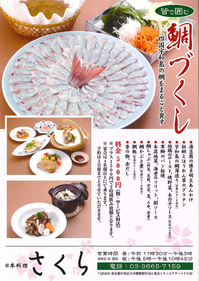 いつも東京シティエアターミナルをご利用くださいまして、誠にありがとうございます。本館2階日本料理「さくら」では、各種メニュー豊富に取り揃えております!各種メニューには、予約が必要なメニューや提供可能な最低人数がございます。ご了承ください。●店舗情報はこちら~日本料理「さくら」料理長 伊東一也の展示会出展作品のご紹介~(出典)日本料理専門誌「月刊 日本料理」<鯛づくしメニュー><忘新年会メニュー><しゃぶしゃぶ食べ放題>