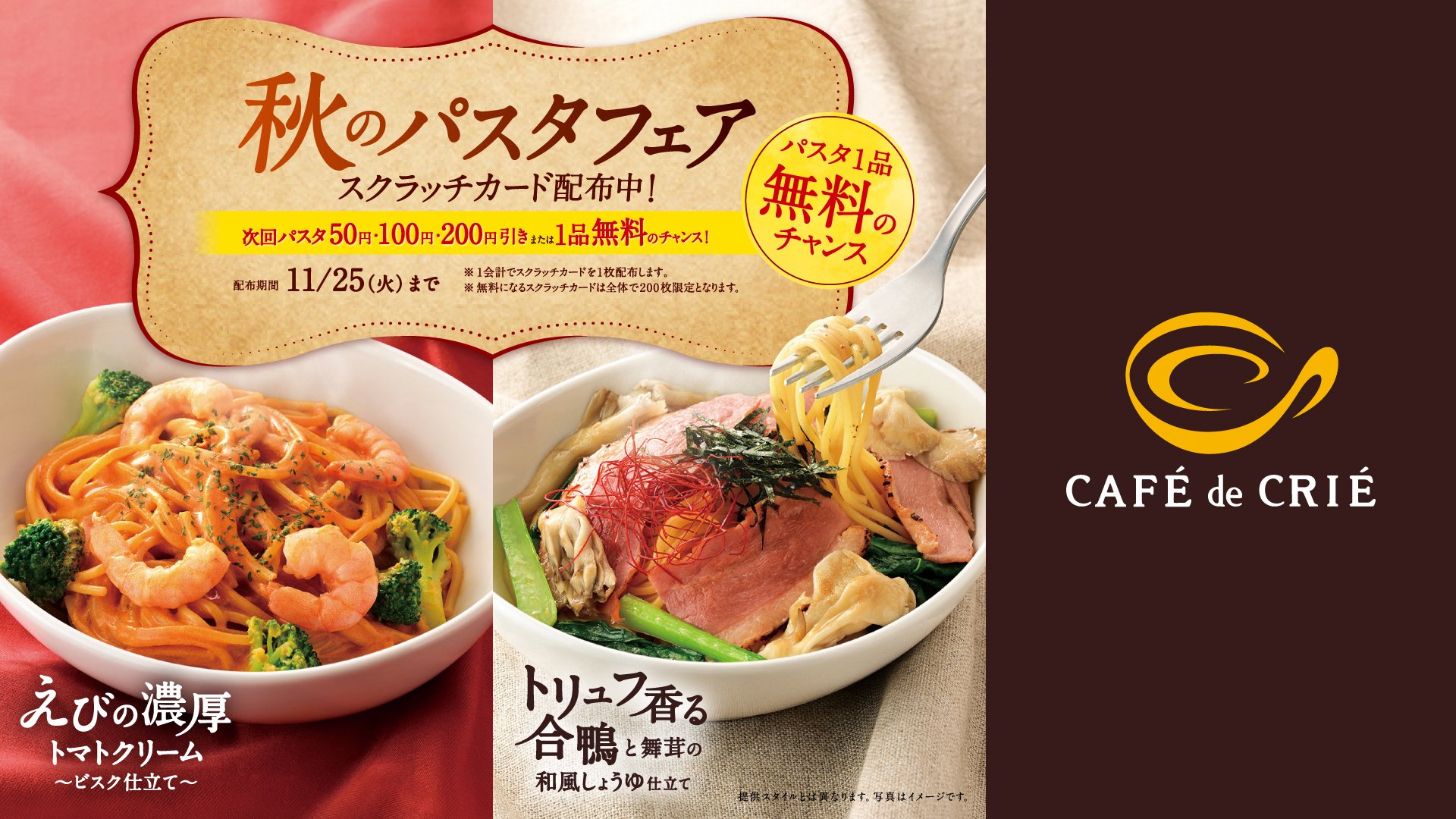 カフェ・ド・クリエでは9月17日(水)より「秋のパスタフェア」を開催します。