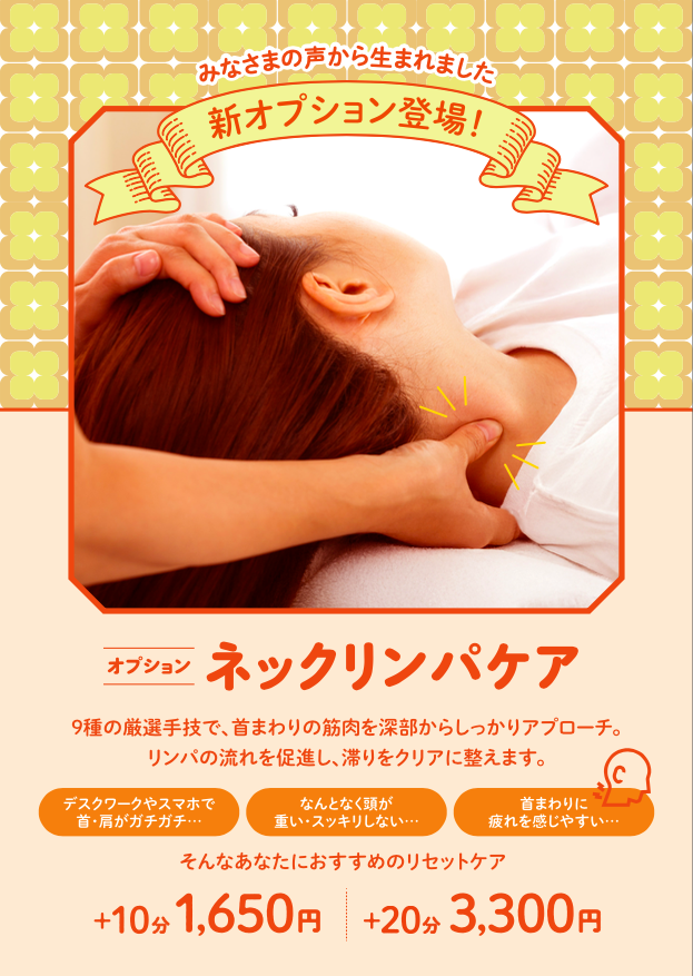 首をジェルで流す新オプションが登場しました!9種の厳選手技で、首まわりの筋肉を深部からしっかりアプローチします。リンパの流れを促進し、滞りをクリアに整えます♪デスクワークで首肩ガチガチ、なんとなく頭がスッキリしないという方におすすめです。
